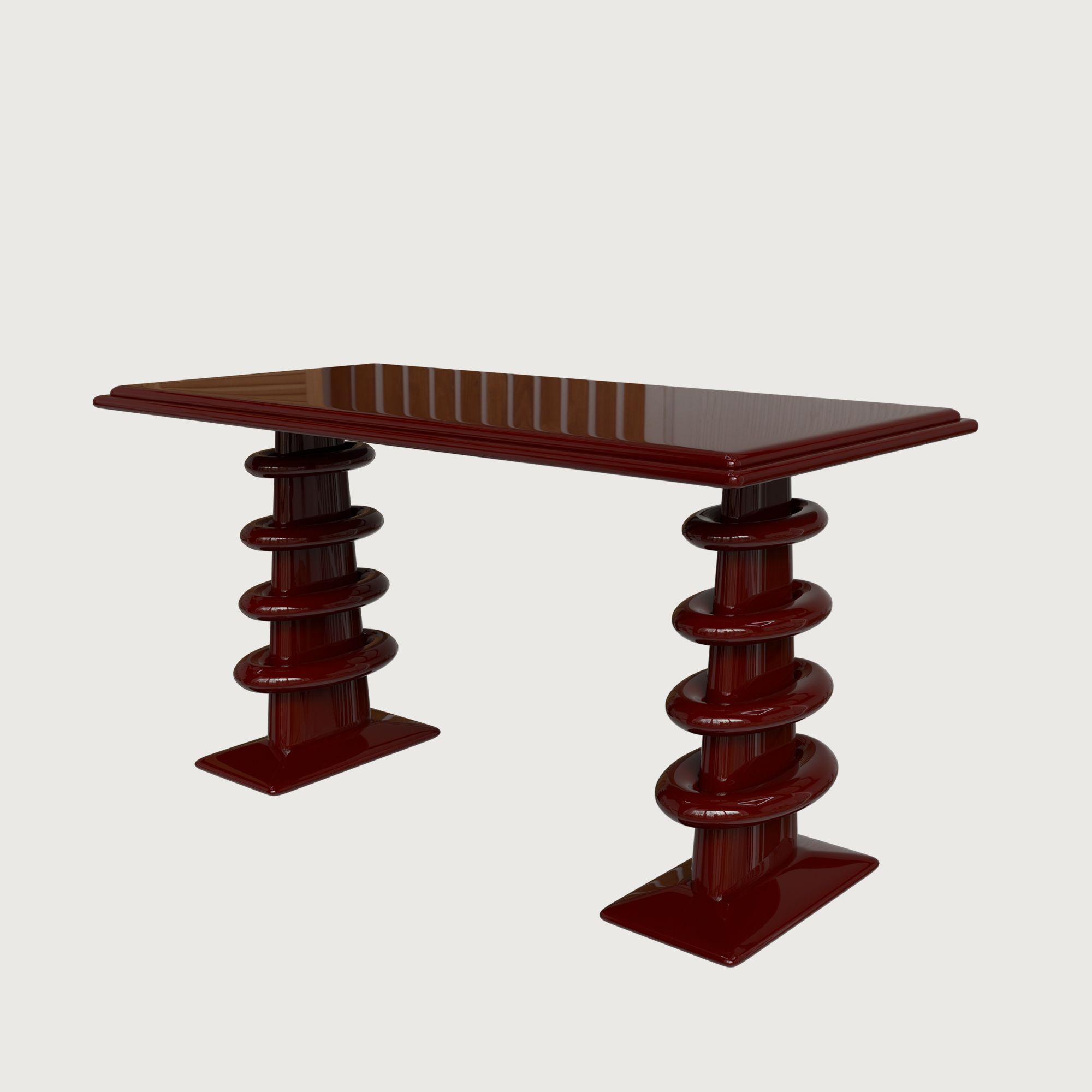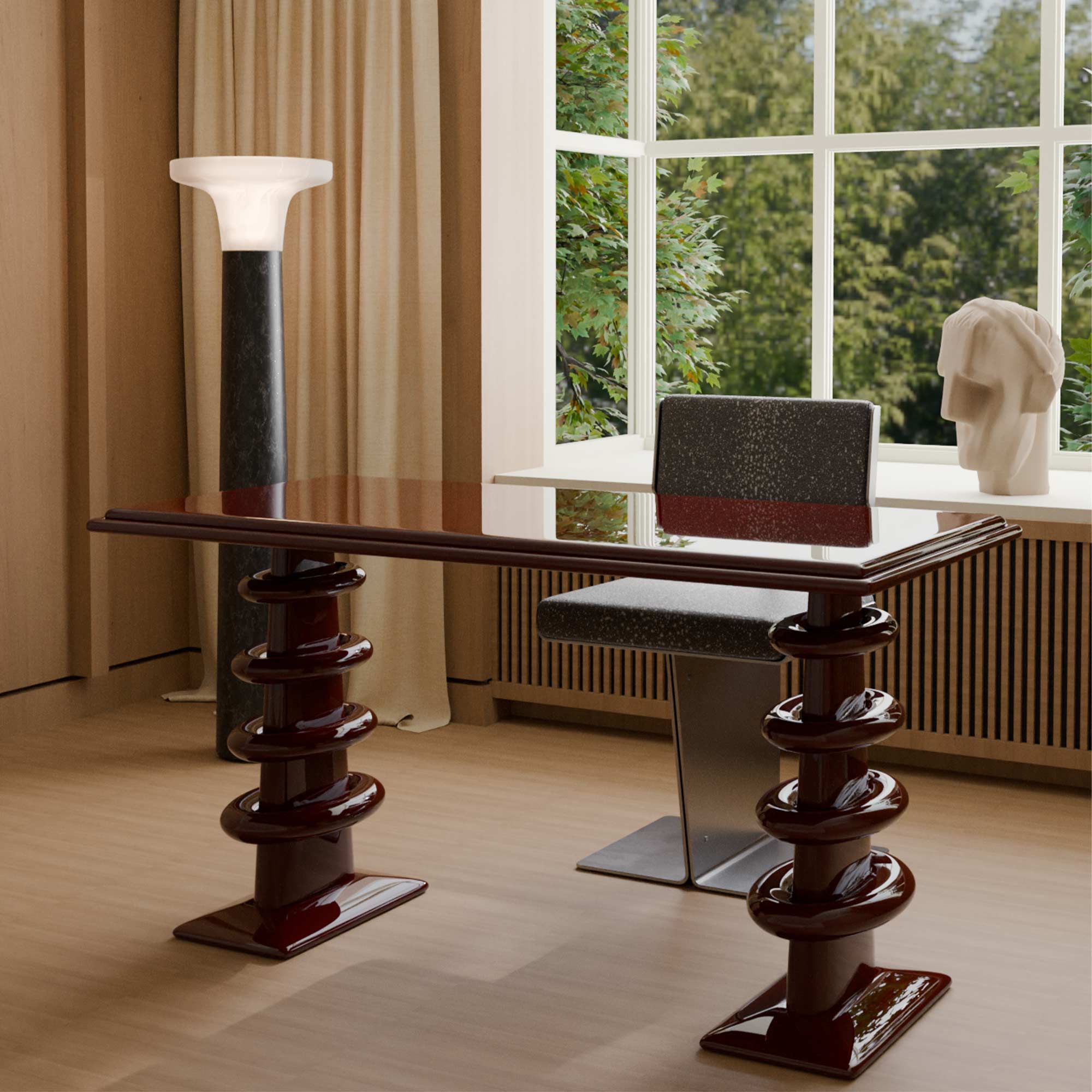 Подстолье выполнено в виде ритмично наслаивающихся округлых форм, будто нанизанных друг на друга, как воспоминания, складывающиеся в историю. Эта конструкция вызывает ощущение игры, движения и визуальной энергии. Благодаря такому архитектурному приёму стол воспринимается не просто как предмет мебели, а как арт- объект.