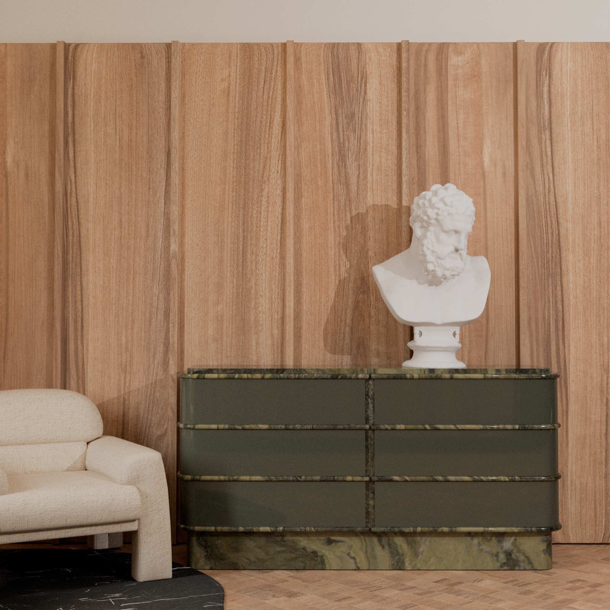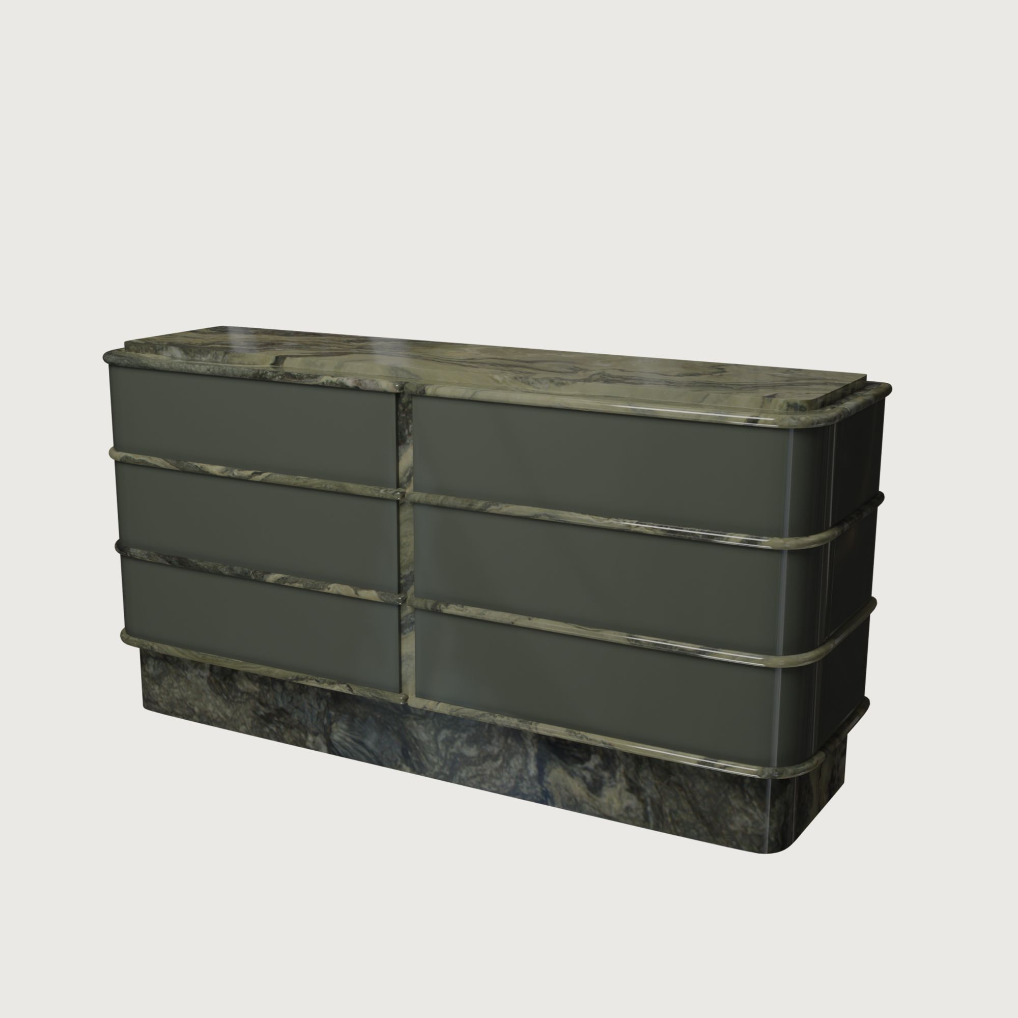 Изделие сочетает превосходную эргономику с выразительным эстетическим решением: шесть вместительных ящиков, плавные, обтекаемые линии и эффектное сочетание материалов. В глянцевом исполнении комод напоминает роскошный и притягательный концертный рояль, а в варианте из мрамора он выглядит монументально и эксклюзивно.