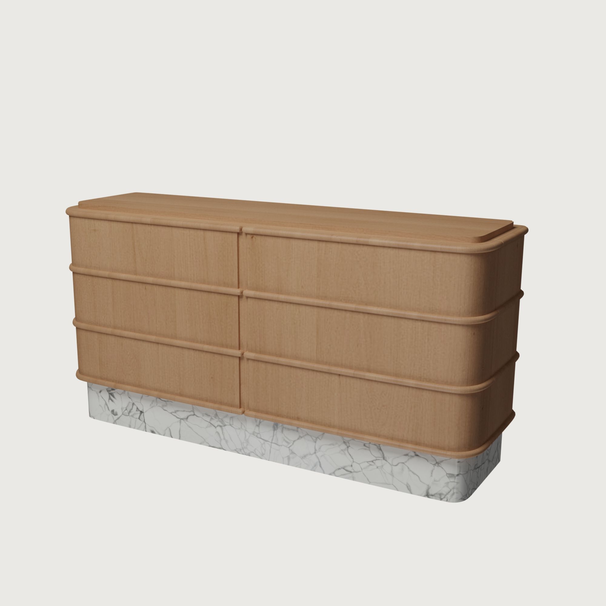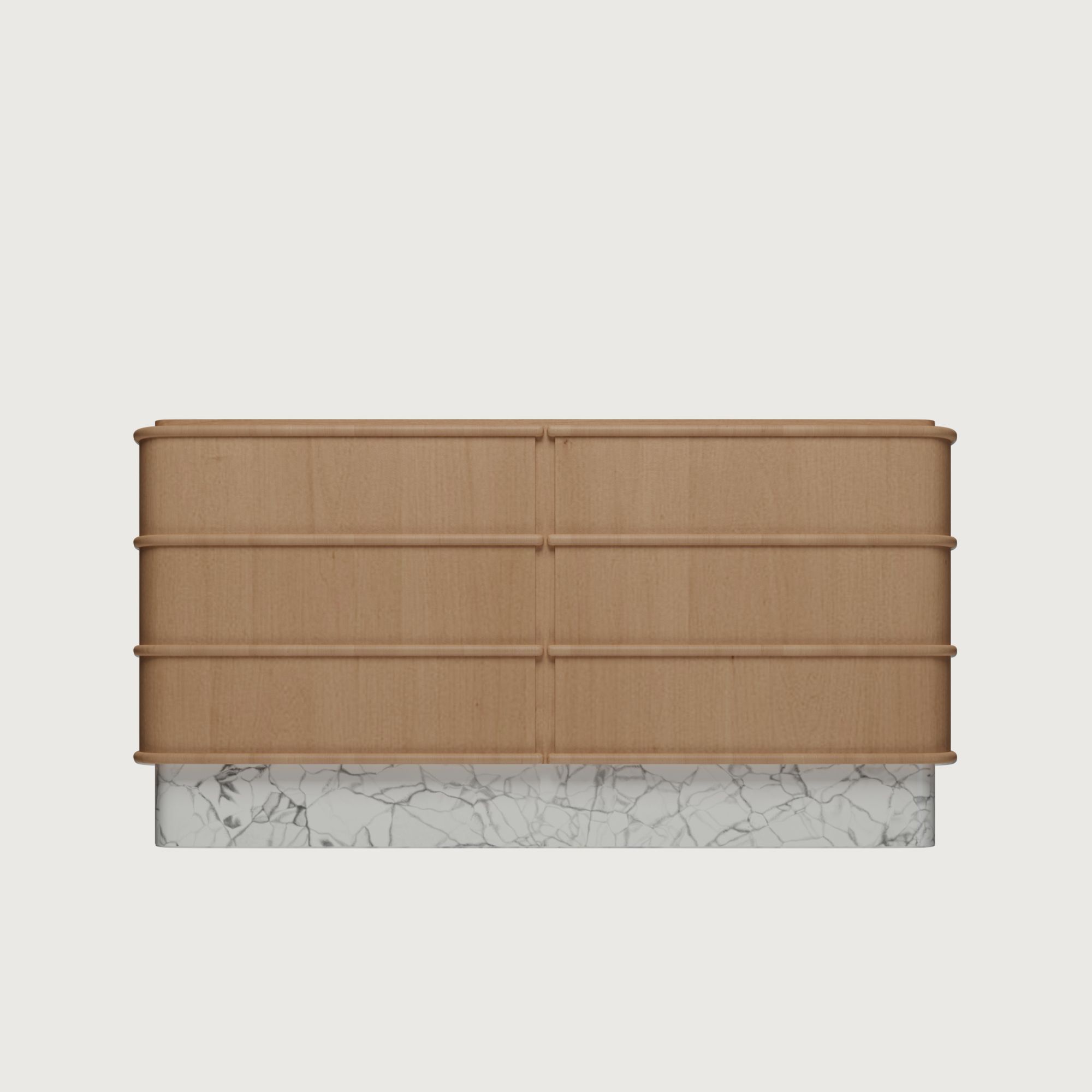 Изделие сочетает превосходную эргономику с выразительным эстетическим решением: шесть вместительных ящиков, плавные, обтекаемые линии и эффектное сочетание материалов. В глянцевом исполнении комод напоминает роскошный и притягательный концертный рояль, а в варианте из мрамора он выглядит монументально и эксклюзивно.