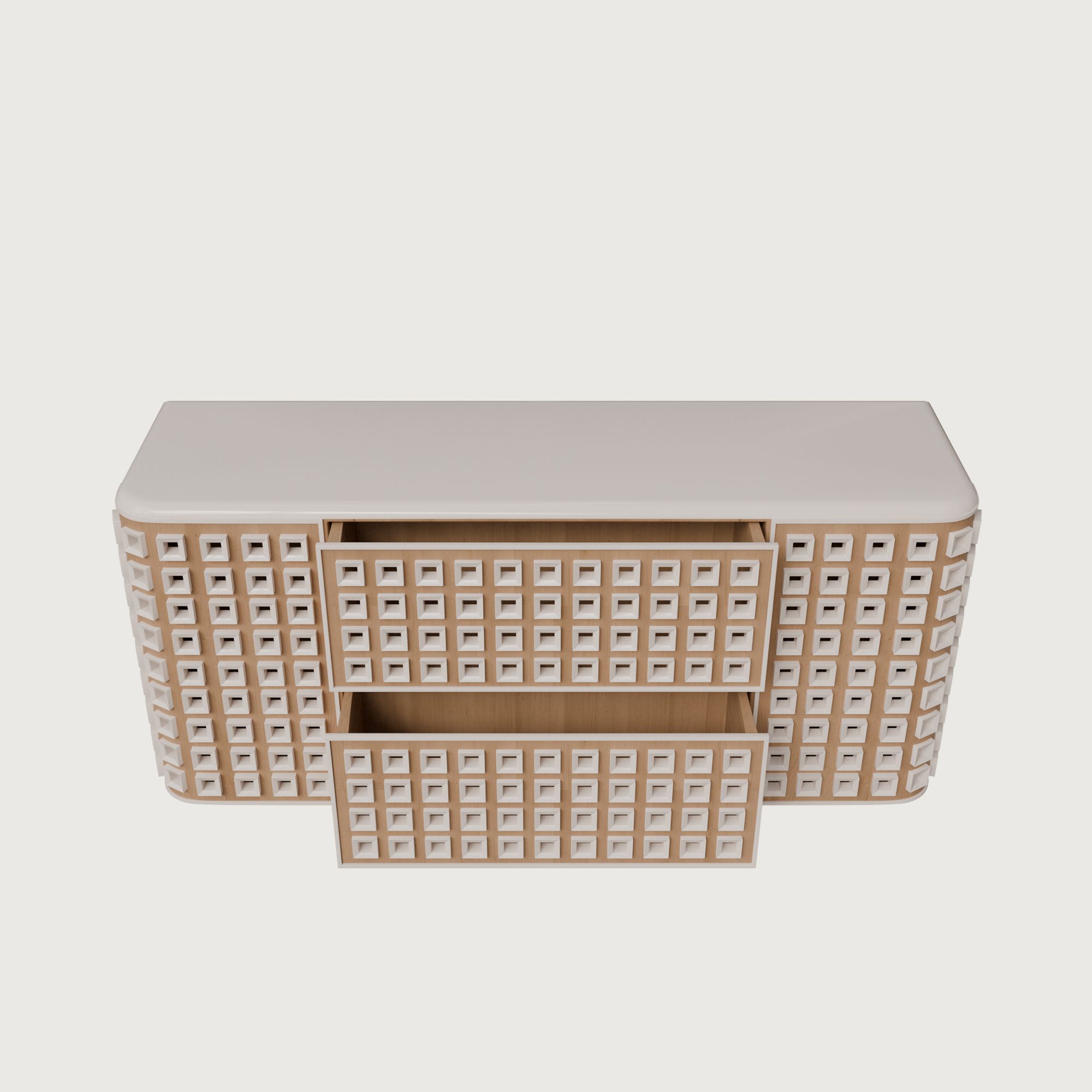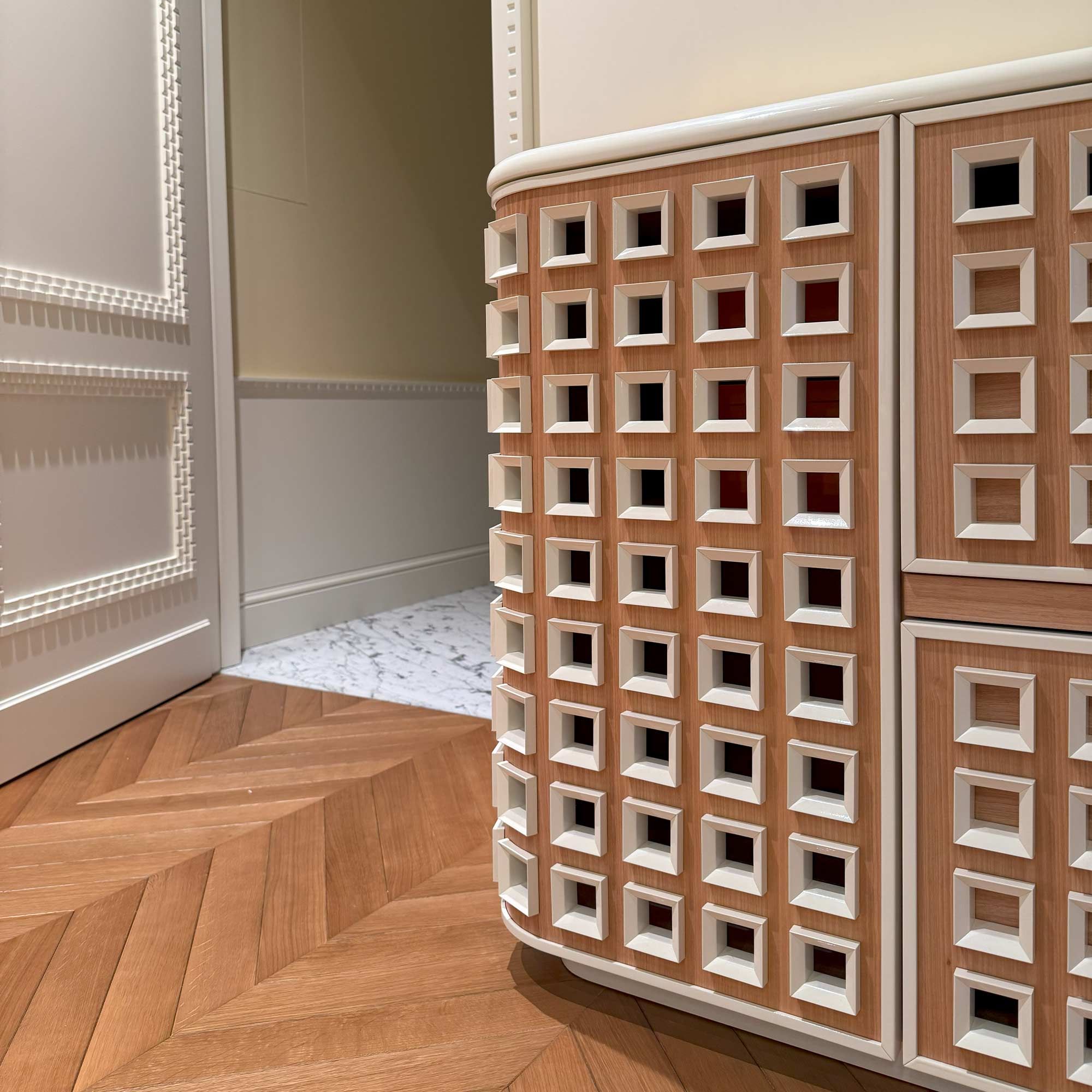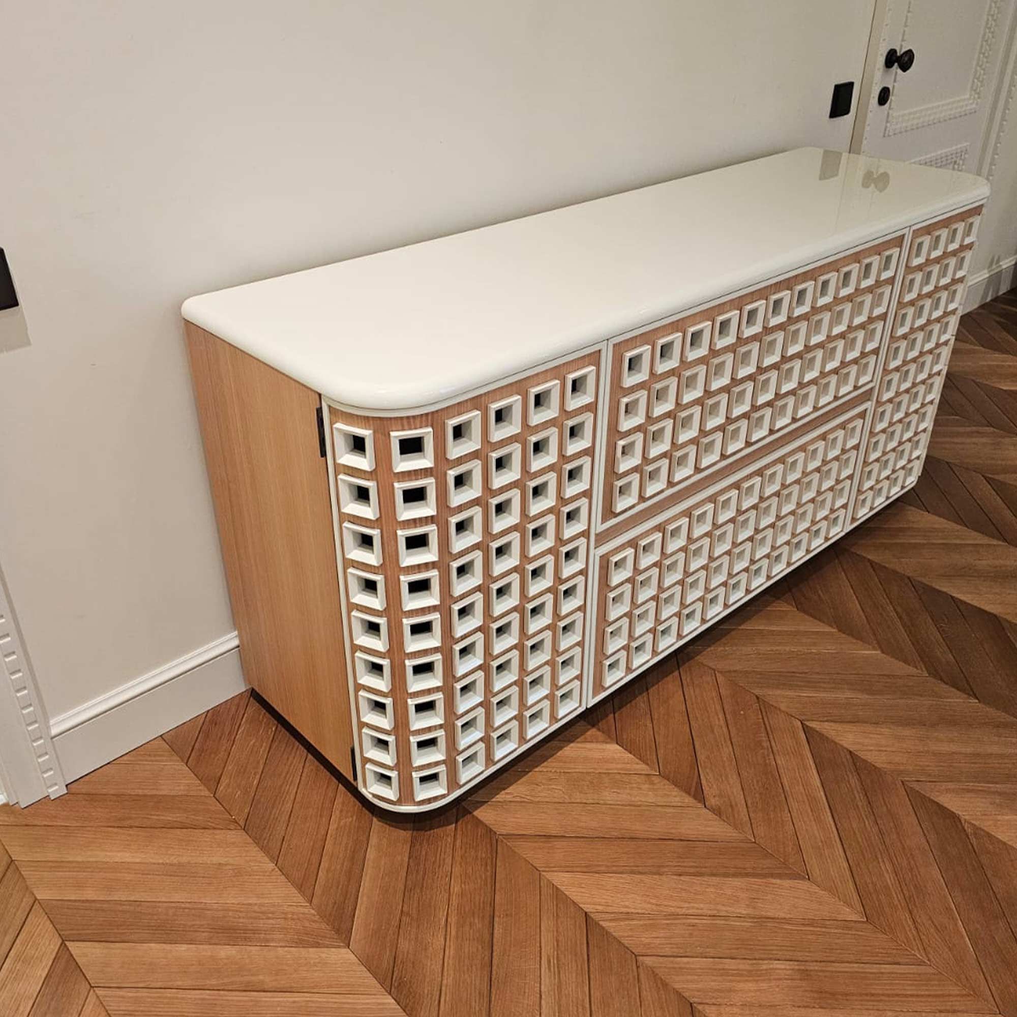 STARS выпускается в нескольких вариантах отделки: селективный шпон анегри или матовая эмаль на контрасте с глянцевым покрытием деталей. Это делает комод STARS выбором тех, кто ценит ремесленное искусство, надёжность и визуальную силу дизайна.