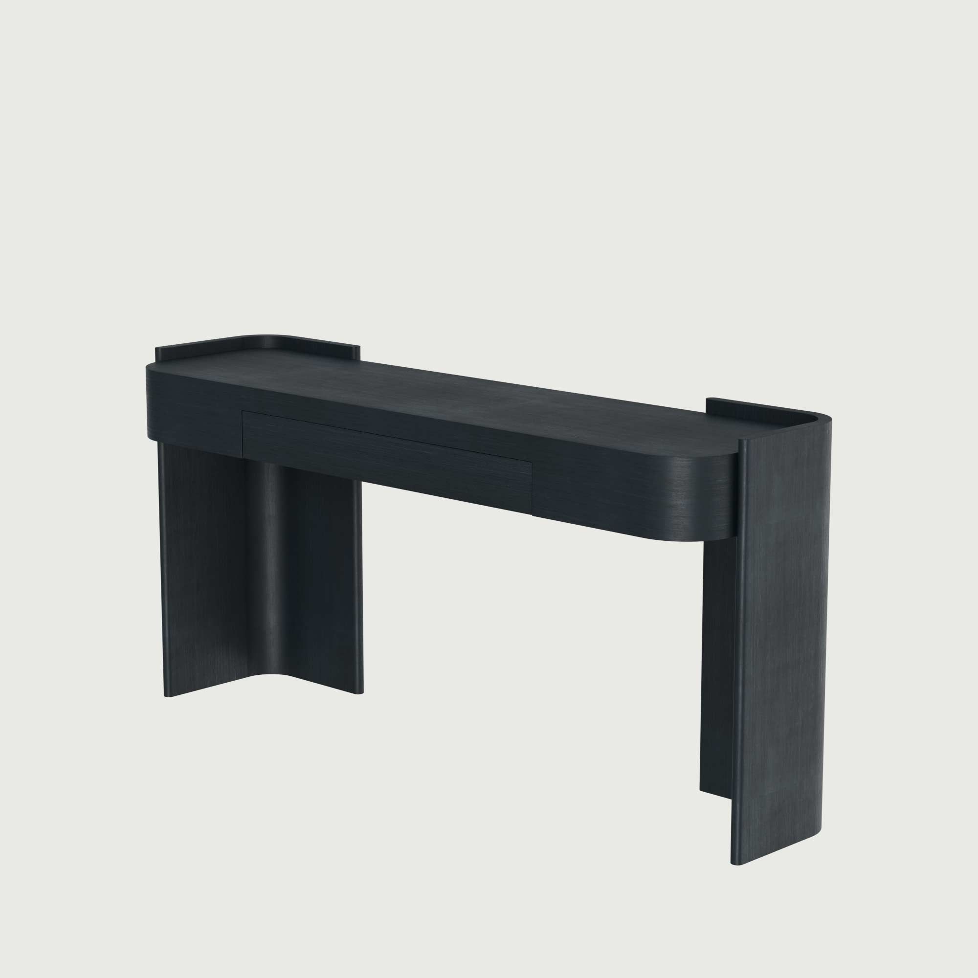 CLIP выполнена с изогнутыми боковыми панелями, создающими эффект обволакивания, будто тонкий лист материала обернул центральный корпус. Этот плавный изгиб делает консоль визуально лёгкой, но устойчивой. Центральный ящик встроен так, что сохраняется целостность поверхности без визуального нарушения линий.