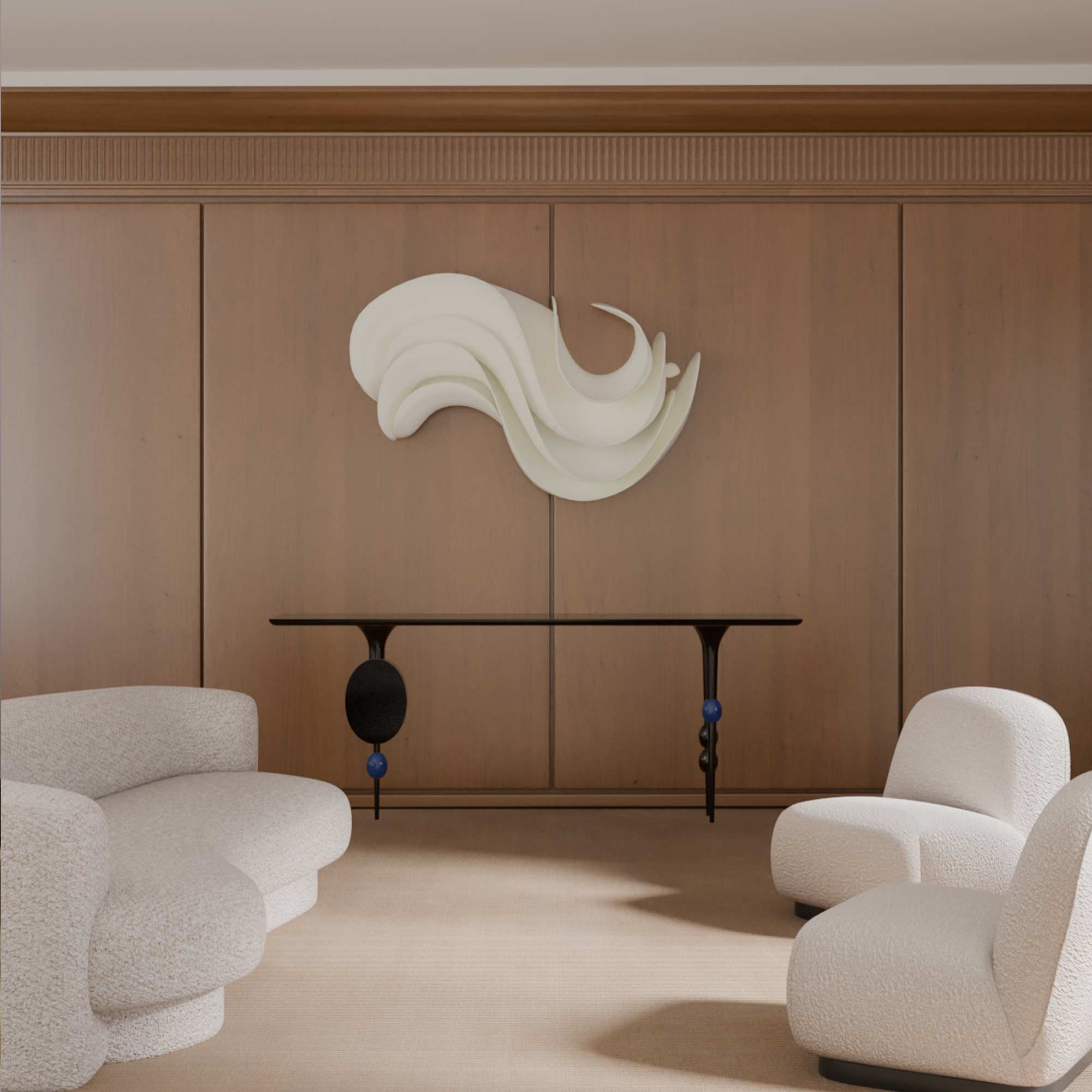 Консоль LEILA — это выразительный арт-объект, балансирующий между дизайном и скульптурой. Её эксцентричный, но гармоничный силуэт сочетает в себе чёткую графику и плавную органику. Глубокое глянцевое чёрное покрытие усиливает драматизм формы, создавая игру света и отражений на поверхности.
