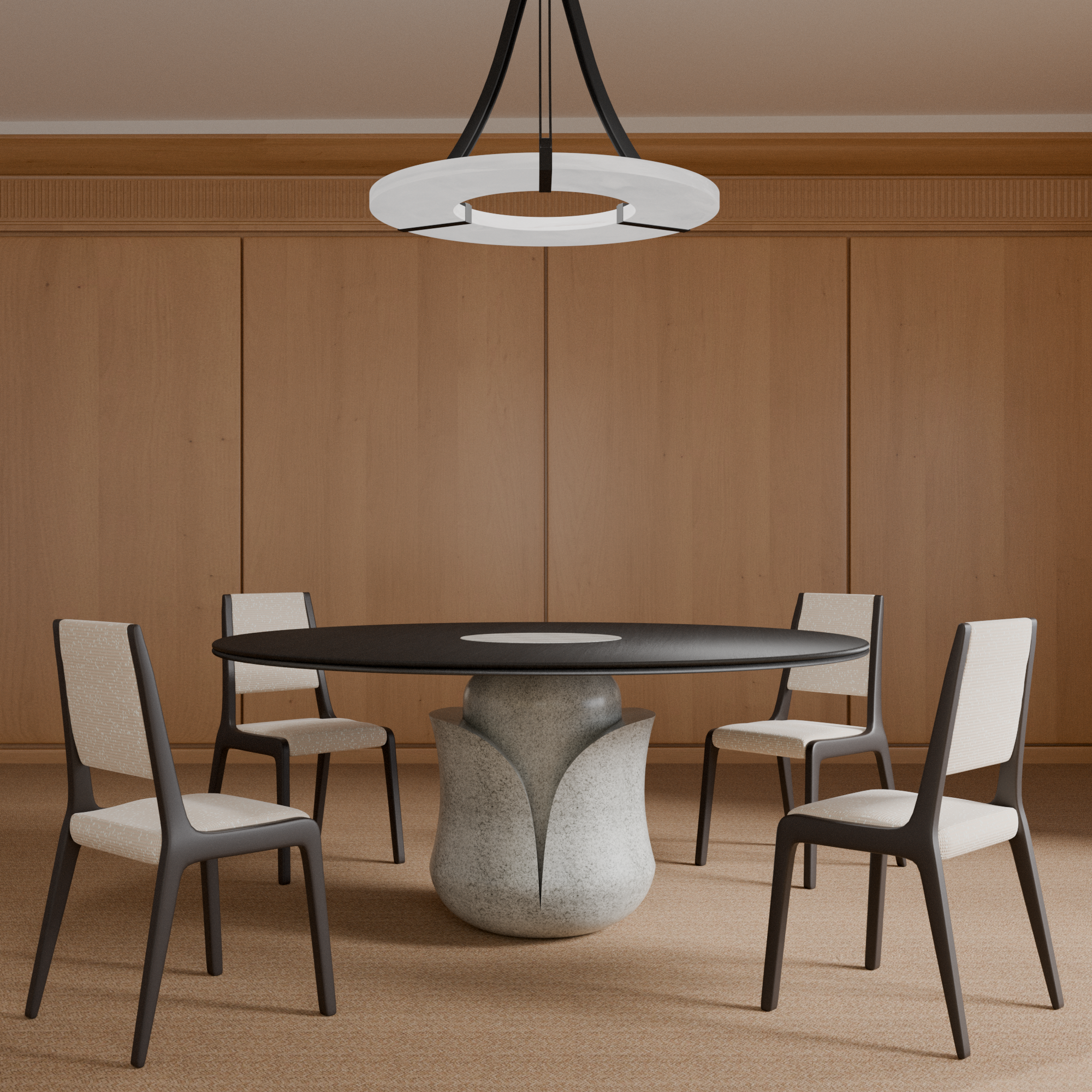 Модель TULIP доступна в трёх размерах: 1500 мм, 1600 мм и 1700 мм. Подстолье можно выполнить из керамики или массива дерева, позволяя адаптировать стол к различным стилям интерьера и предпочтениям владельцев.