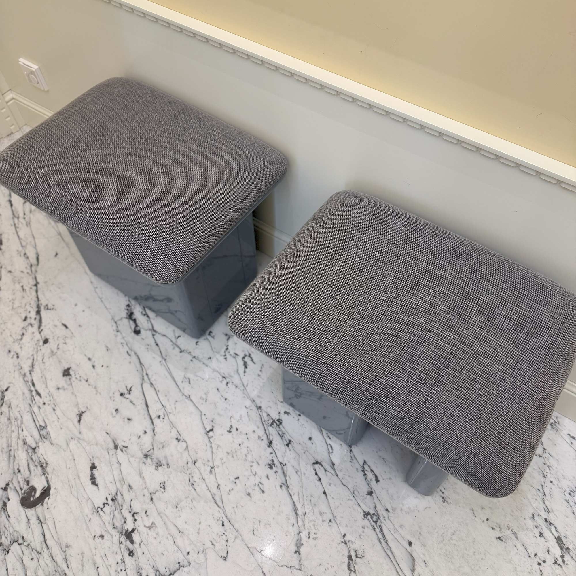 Основа табурета выполнена из массива и покрыта серым глянцем, который придаёт изделию современный и чистый вид, в то время как сидушка обита текстилем с мягкой фактурой, обеспечивая комфорт при использовании. Контраст матовой текстуры ткани и глянцевой поверхности основания делает изделие визуально интересным.